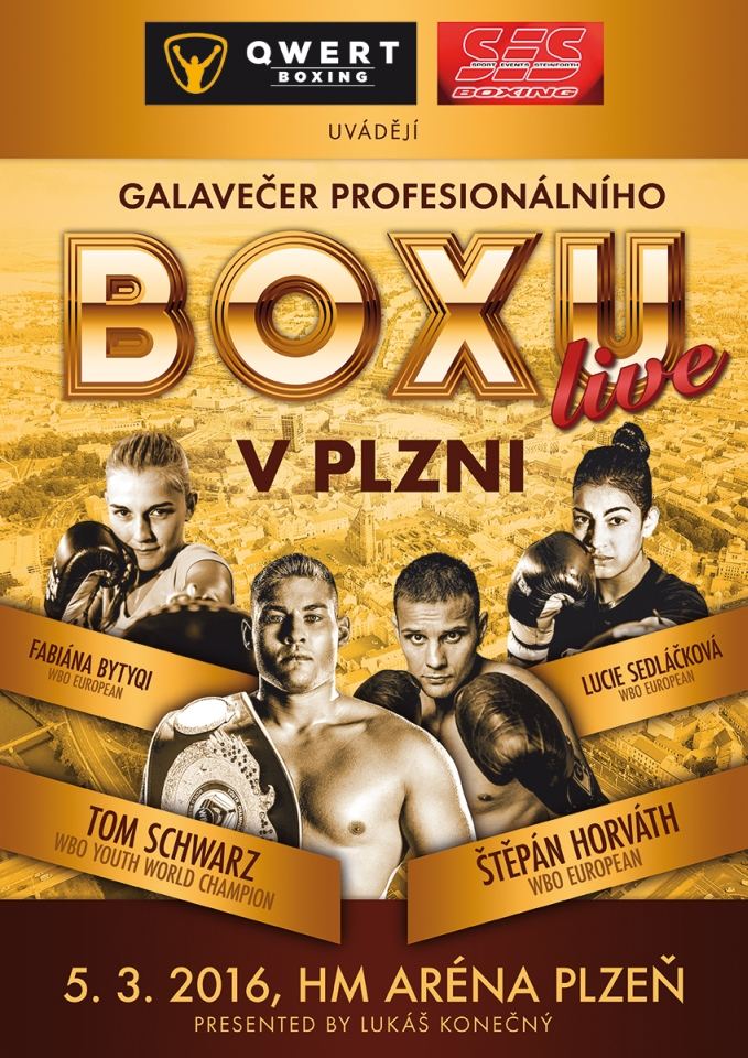 Dovolujeme si Vás pozvat na výjimečný Galavečer profesionálního boxu, který se uskuteční 5. března od 19:30 hodin v plzeňské HM Aréně. Prožijete jedinečnou akci, kde se Vám představí české i světové špičky. Budete svědci čtyř plánovaných zápasů o titul. Těšit se můžete na takové boxery jako jsou Fabiana Bytygi, Lucie Sedláčková, Tom Schwarz, Štěpán Horváth a mnoho dalších. Nenechte si ujít tento galavečer!