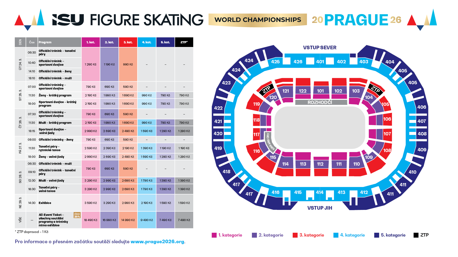 Veřejný prodej odstartuje ve čtvrtek 29. května. Vstupenky jsou k dispozici v pěti cenových kategoriích od 790 Kč za krátké programy, boje o světové medaile je možné zakoupit už za 1 290 Kč. Na jeden nákup bude možné zakoupit až 6 vstupenek na jednotlivé soutěže a 4 all-event vstupenky.